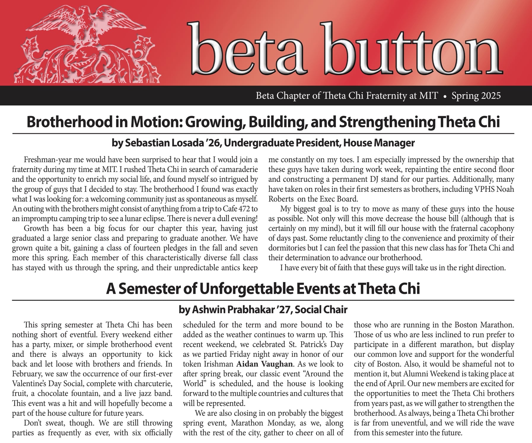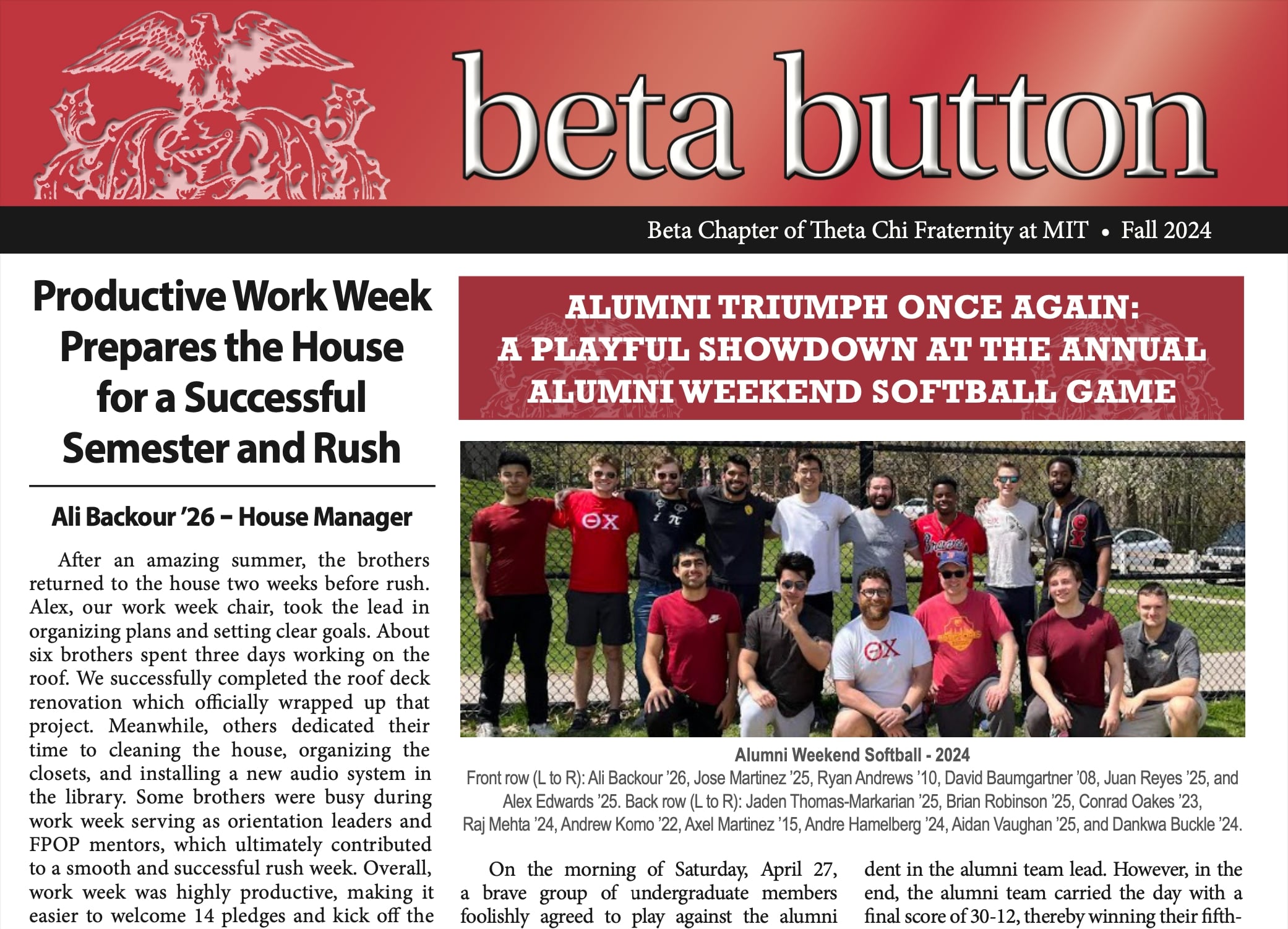 The Beta Button is our semiannual chapter newsletter. It is used to share recent updates and happenings at 528 Beacon with our alumni around the world, and has been in publication since 1916. Click below to view recent issues.