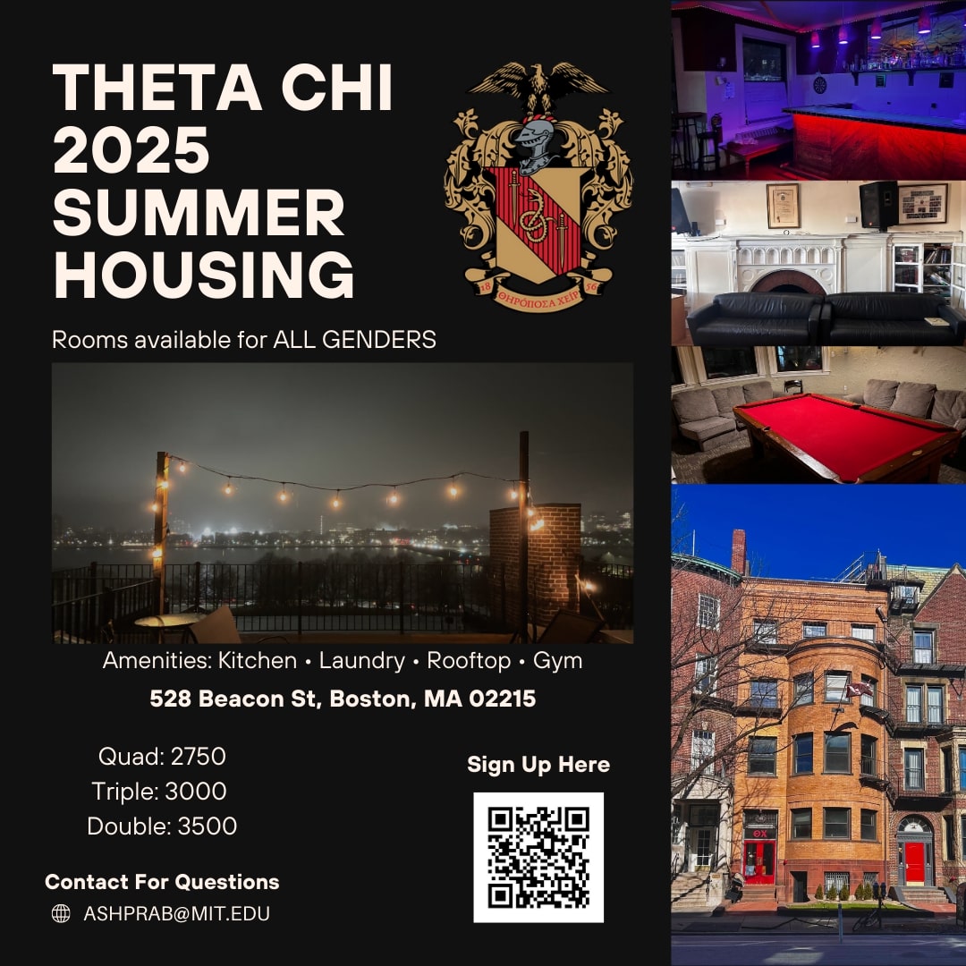 Looking for summer housing in Boston? Come stay at Theta Chi this summer! We are located at 528 Beacon Street, right next to the Harvard Bridge. Our diverse community has a host of amenities. Some of which include: a projector room, common area, in-house gym, industrial kitchen with refrigerators and pantries, a roof deck, and bike storage. Other amenities include MIT WiFi, parking for summer residents ($500), and free in-house washers and dryers.